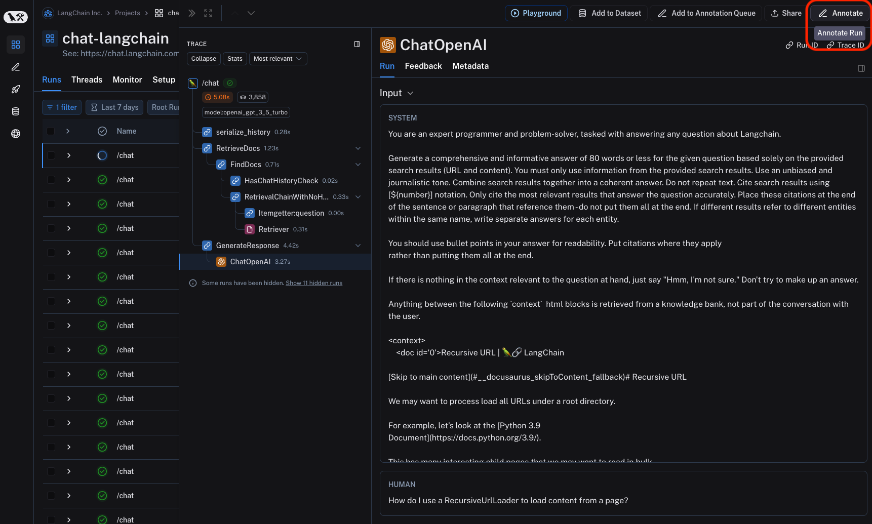 LangSmith allows you to manually annotate traces with feedback within the application. This can be useful for adding context to a trace, such as a user’s comment or a note about a specific issue.