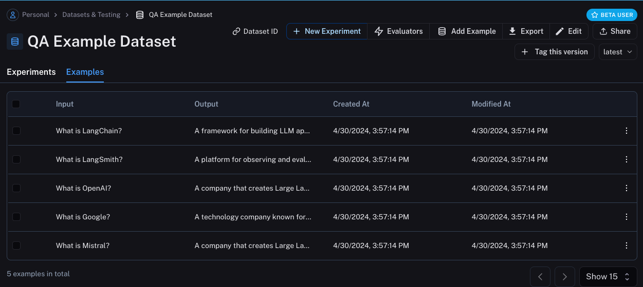 QA Example Dataset in the Datasets & Testing page, when we click into it we should see that we have five new examples.