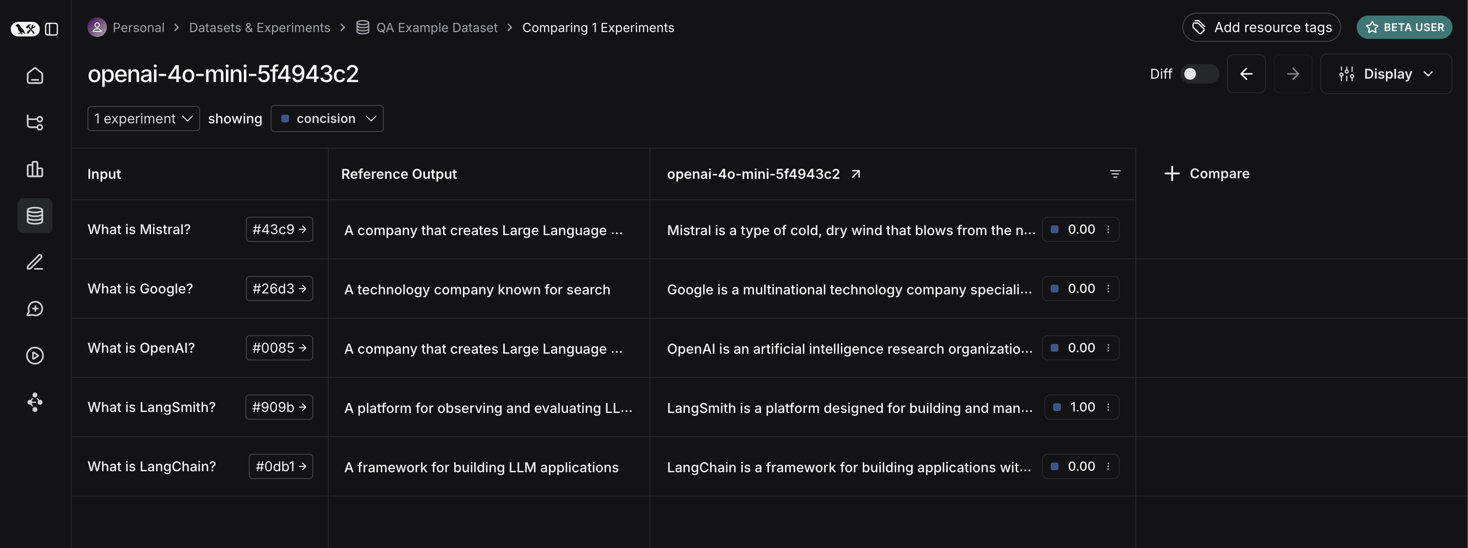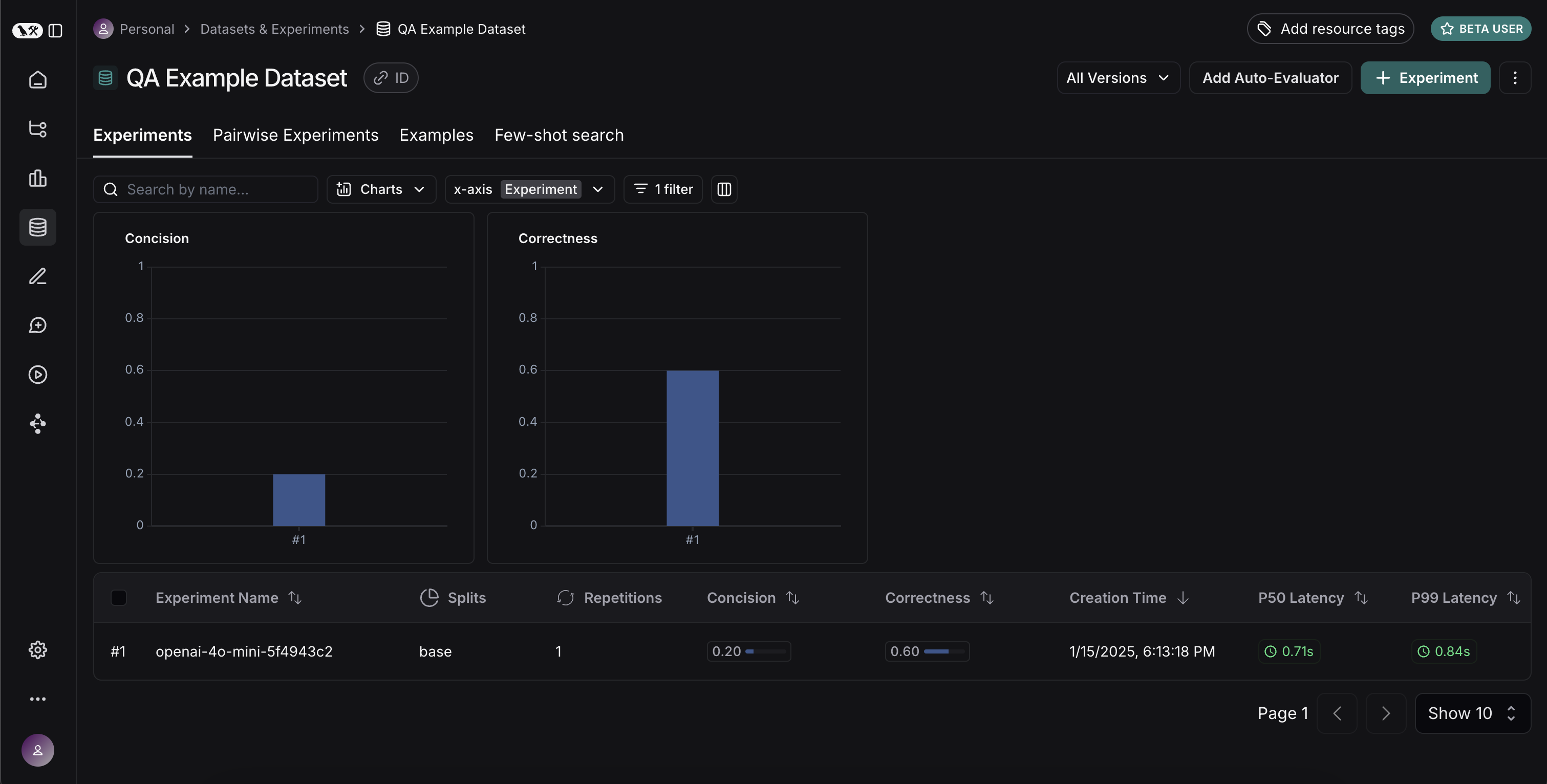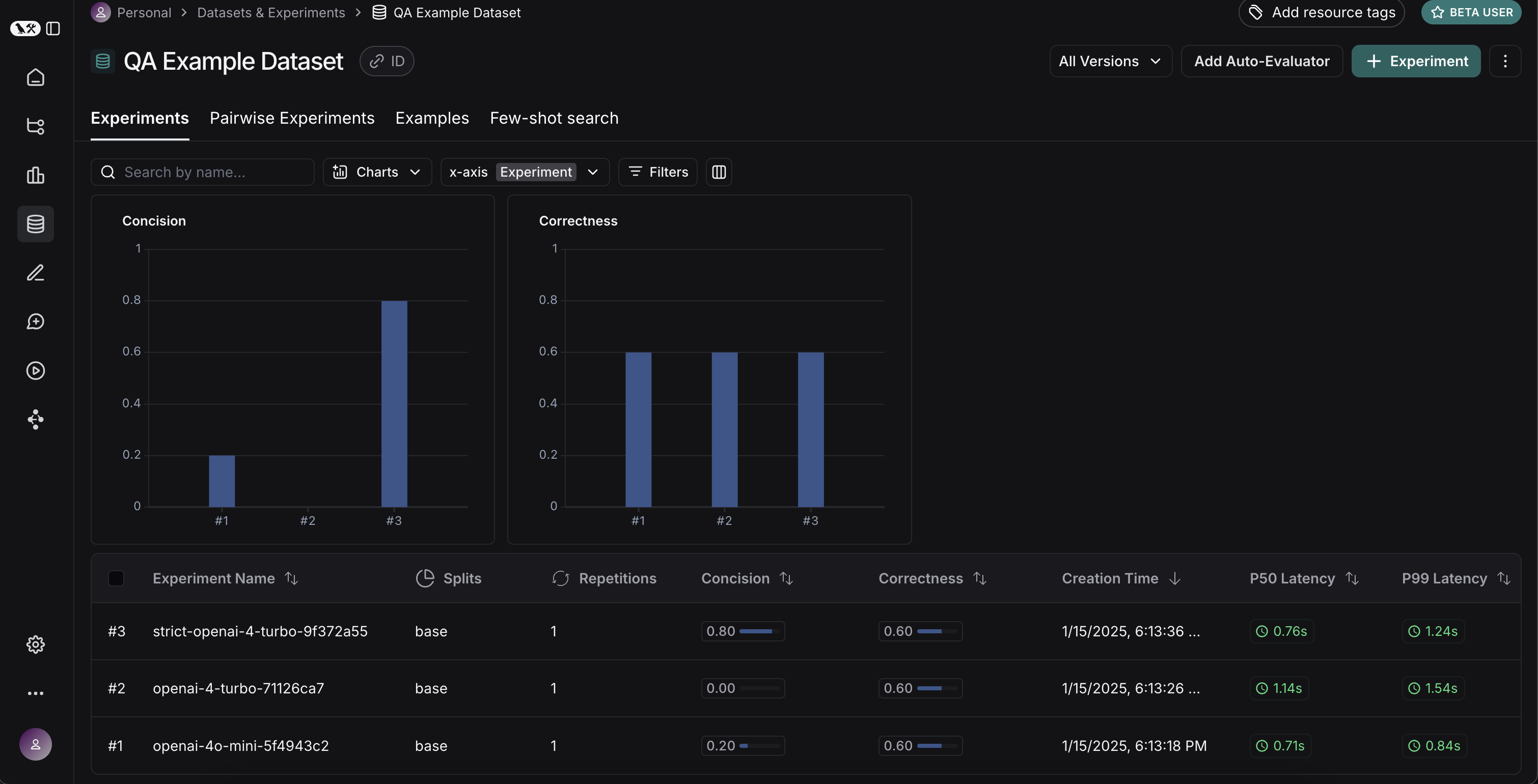 Awesome, we’ve evaluated three different runs. But how can we compare results? The first way we can do this is just by looking at the runs in theExperiments tab. If we do that, we can see a high level view of the metrics for each run: