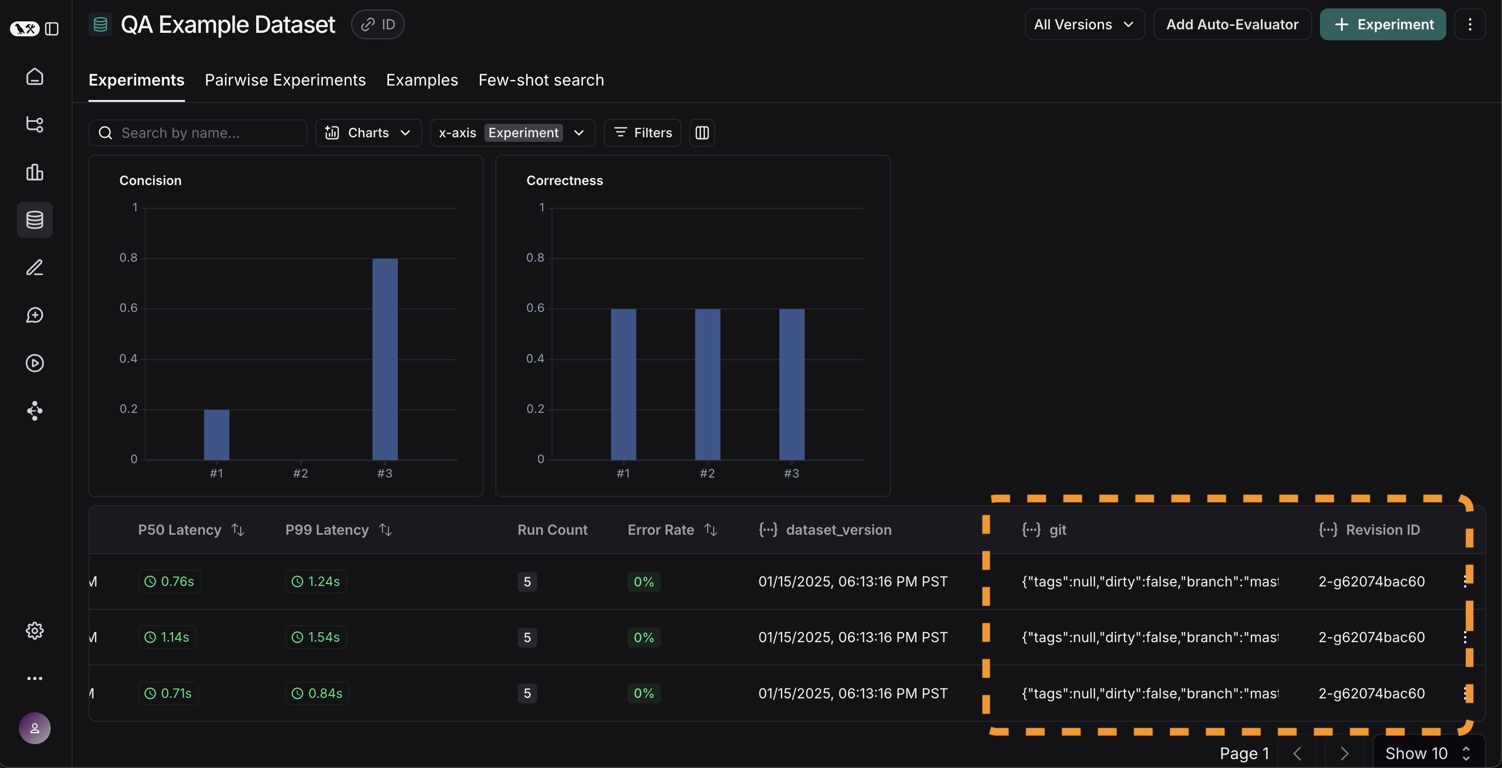 Now that we’ve got these experiments running in an automated fashion, we want to track these results over time. We can do this from the overallExperiments tab in the datasets page. By default, we show evaluation metrics over time (highlighted in red). We also automatically track git metrics, to easily associate it with the branch of your code (highlighted in yellow).