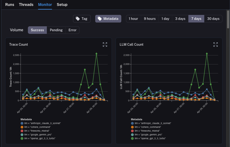 llm. We can group the monitoring charts by ANY metadata attribute, and instantly get grouped charts over time. This allows us to experiment with different LLMs (or prompts, or other) and track their performance over time.